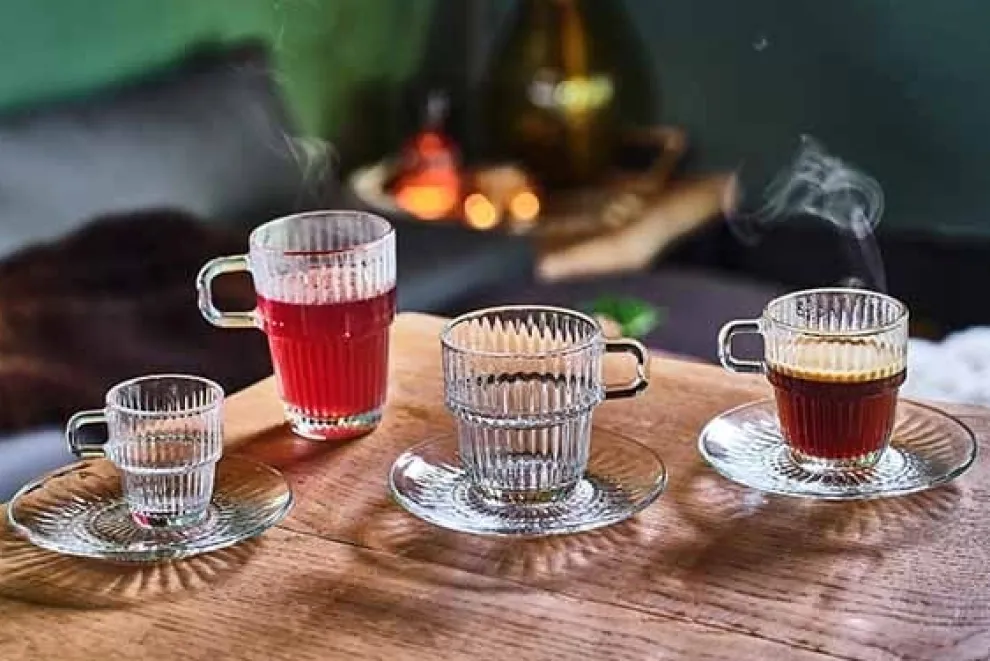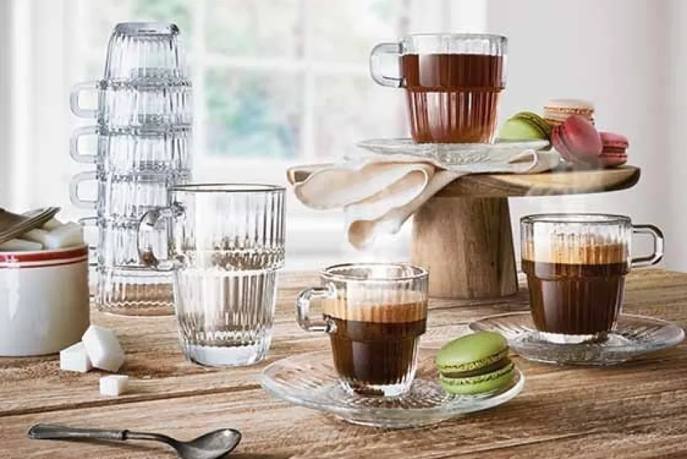 Gehard en stapelbaar, deze serie met 1970s design, accentueert de schittering van het glas en verbetert de inhoud.