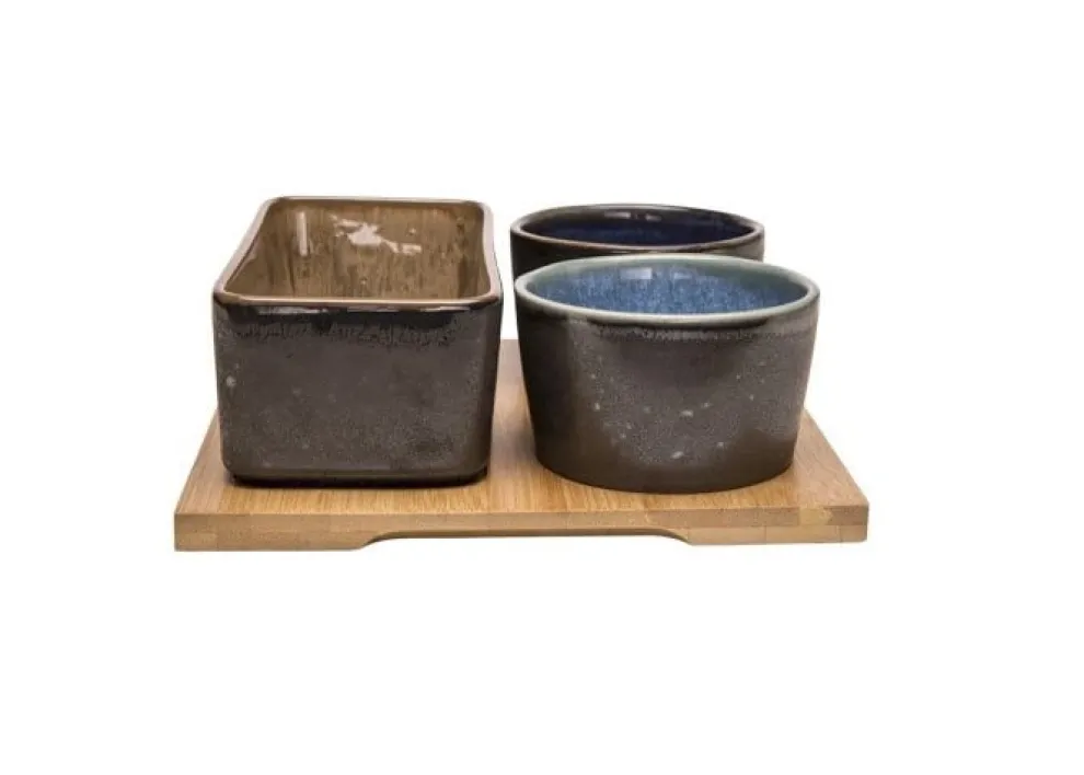 Tijd voor een gezellige aperitief met drie verschillende versnaperingen of dipsausjes. Dankzij de uitsparingen in het bamboe presentatiebord kunt u de schaaltjes gemakkelijk en veilig tegelijk naar de aperitieftafel dragen. De set kan natuurlijk ook op de eettafel gebruikt worden voor sausjes of bijgerechtjes. De schaaltjes zijn gemaakt uit aardewerk.