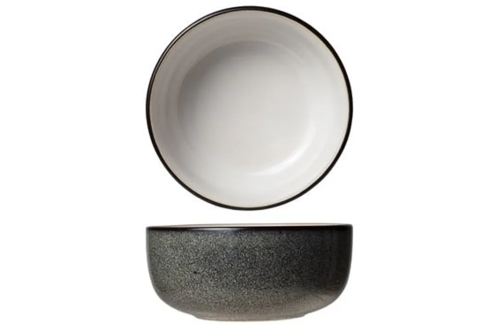 De kleine Ciel Blanc kommetjes van Cosy & Trendy hebben een witte binnenkant die contrasteert met een zwarte, gespikkelde buitenkant en een opvallende zwarte rand. De buitenkant doet denken aan een heldere sterrenhemel.