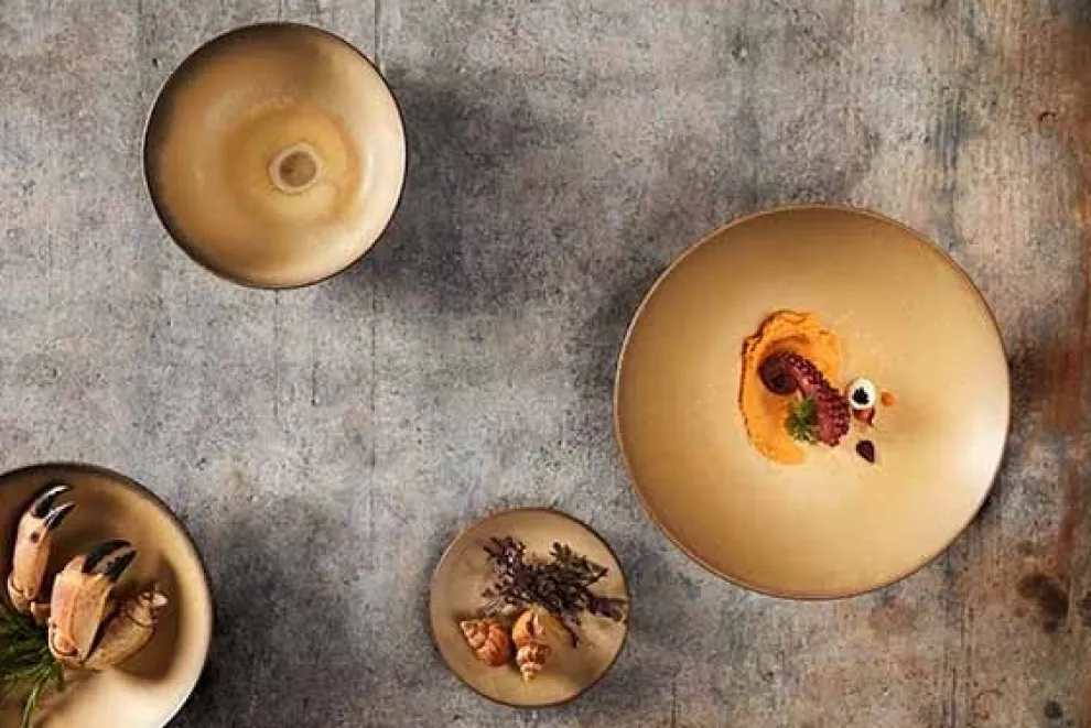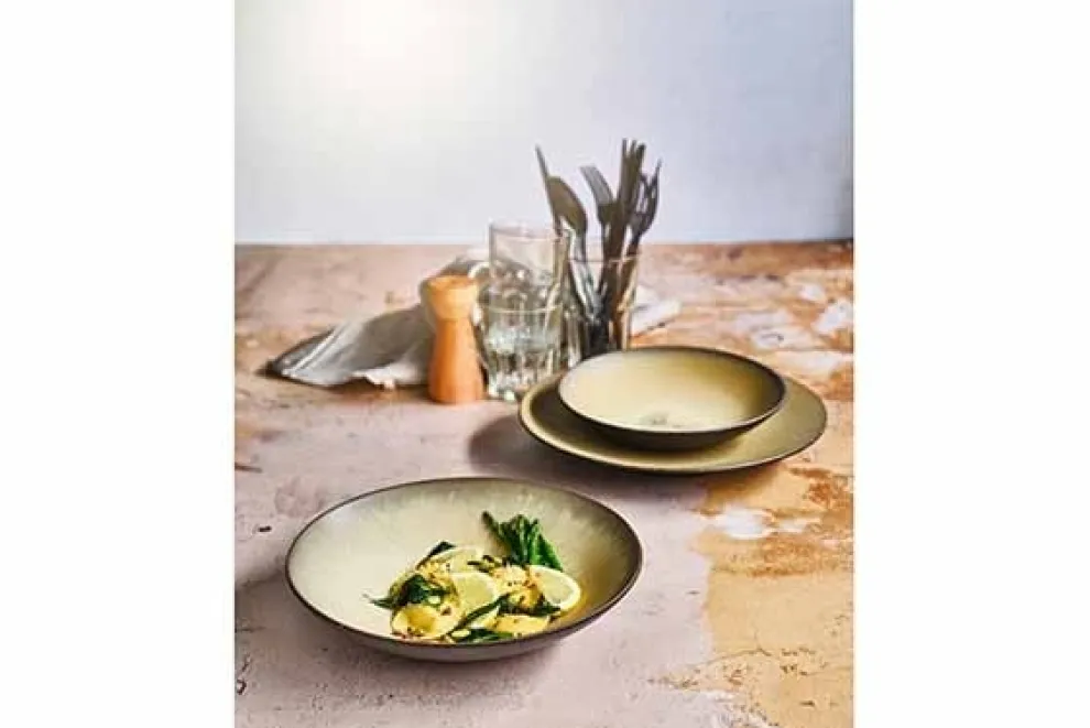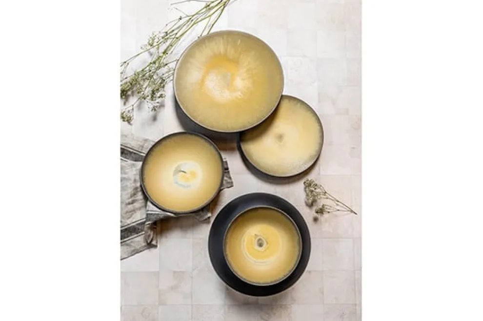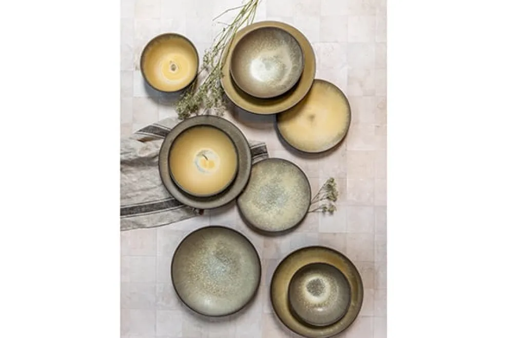 De Divine reeks omarmt de schoonheid van onvolmaaktheid. Dit servies verkent een unieke esthetiek waarbij imperfectie wordt omgezet in kunst, en waar ruwheid en verfijning samensmelten. Elk stuk is doordrenkt van karakter, met een ruw gevoel en uiterlijk aan de binnenzijde. Dit wordt bereikt door een reactieve glazuur, die zorgt voor een fascinerend en uniek effect. Fijne lijnen en stippen stralen naar buiten, als een oerknal van grillige energie die het centrum van elk stuk doet bruisen.