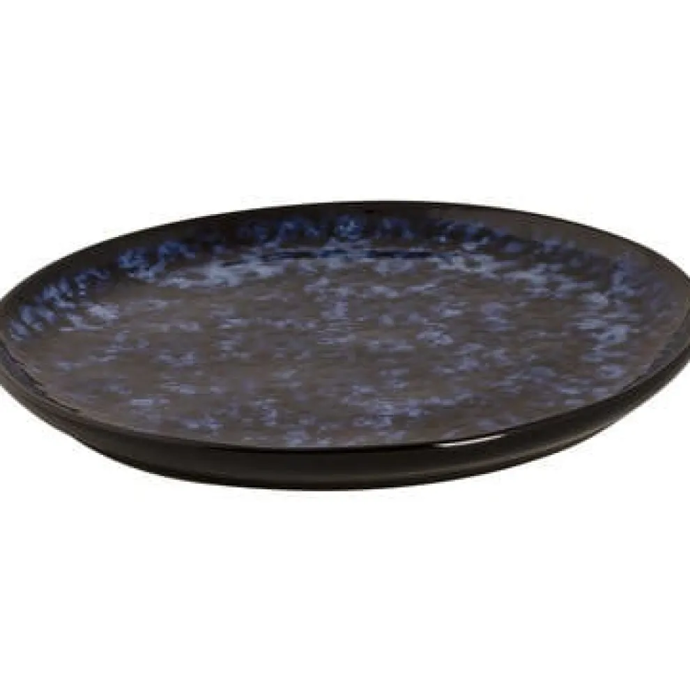Glanzend tot in de perfectie en rijkelijk gedecoreerd, zacht blauw dat zich verdiept tot middernacht. Dit opvallende steengoed is betoverend. Dit prachtige donkere bord heeft een doorsnede van 21 cm en heeft een iets verhoogde rand. Het bord is gemaakt van stoneware.