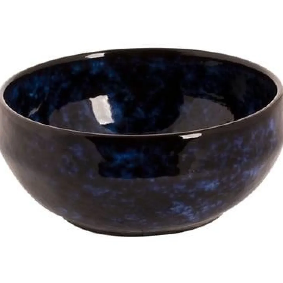 Glanzend tot in de perfectie en rijkelijk gedecoreerd, zacht blauw dat zich verdiept tot middernacht. Dit opvallende steengoed is betoverend. Deze prachtige donkere diepe schaal heeft een doorsnede van 15 cm en een inhoudsmaat van 65 cl. De schaal is gemaakt van stoneware.