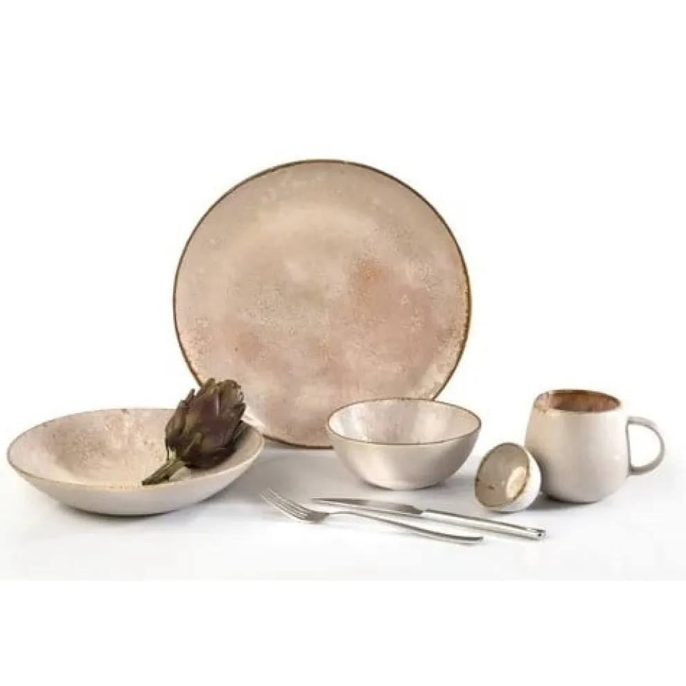De unieke kleurencombinatie van onze collectie Dune laat je onderdompelen in een wereld van elegantie en durf. De zachte zandkleur met intens roze tinten worden versterkt met zijn verfijnde reactieve glazuureffecten en brengen ongetwijfeld een vleugje verfijning aan uw culinaire momenten. De reeks is vervaardigd uit Stoneware, geschikt voor het gebruik in de vaatwasmachine en bovendien micro- en ovenbestendig tot 200°C. De reeks bestaat uit: plat bord 215mm-300mm; diep coupe bord 230mm; bowl 65-150mm; mok.