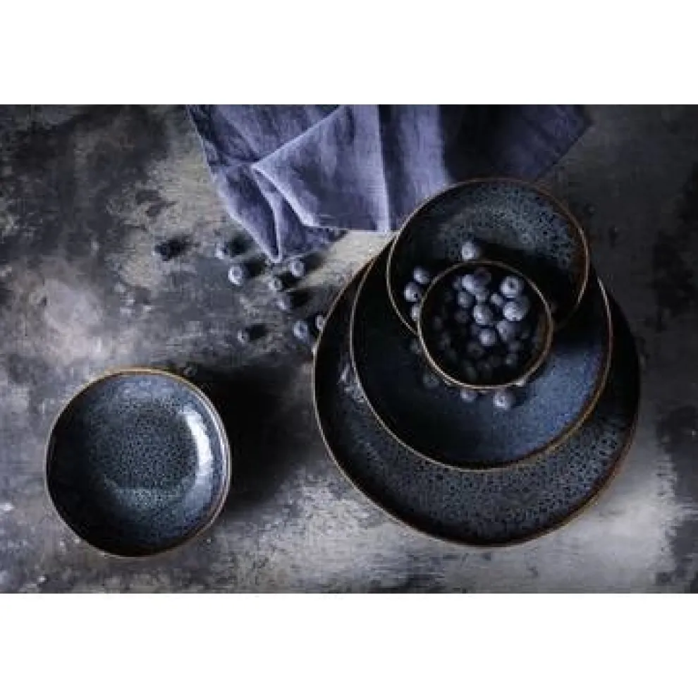 Het opvallende Eccentric servies van Palmer is met zijn donkere petrol kleur een echte eyecatcher op je tafel. De borden en kommen hebben een gevlekte textuur en een prachtige glans die voor een extra dimensie zorgen. De kleuren van je culinaire creaties zullen opvallen op dit zwart blauwe servies. Deze serviesset is gemaakt van het materiaal stoneware en is hittebestendig tot een temperatuur van 220℃.