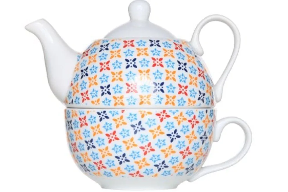 Gezellige theepot + kop voor een lekker kopjes thee. Het mooie motief siert uw tafel op.